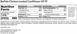 Buffalo Chicken Loaded Cauliflower GF FF – Nutrition Label Post navigationPrevious post: Buffalo Chicken Loaded Cauliflower (contains milk) GF FF Leave a Reply Cancel replyYour email address will not be published. Required fields are marked *Comment * Name * Email * Website Δ