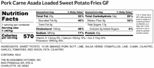 Pork Carne Asada Loaded Sweet Potato Fries GF – Nutrition Label (1) Post navigationPrevious post: Pork Carne Asada Loaded Sweet Potato Fries (contains milk) GF Leave a Reply Cancel replyYour email address will not be published. Required fields are marked *Comment * Name * Email * Website Δ