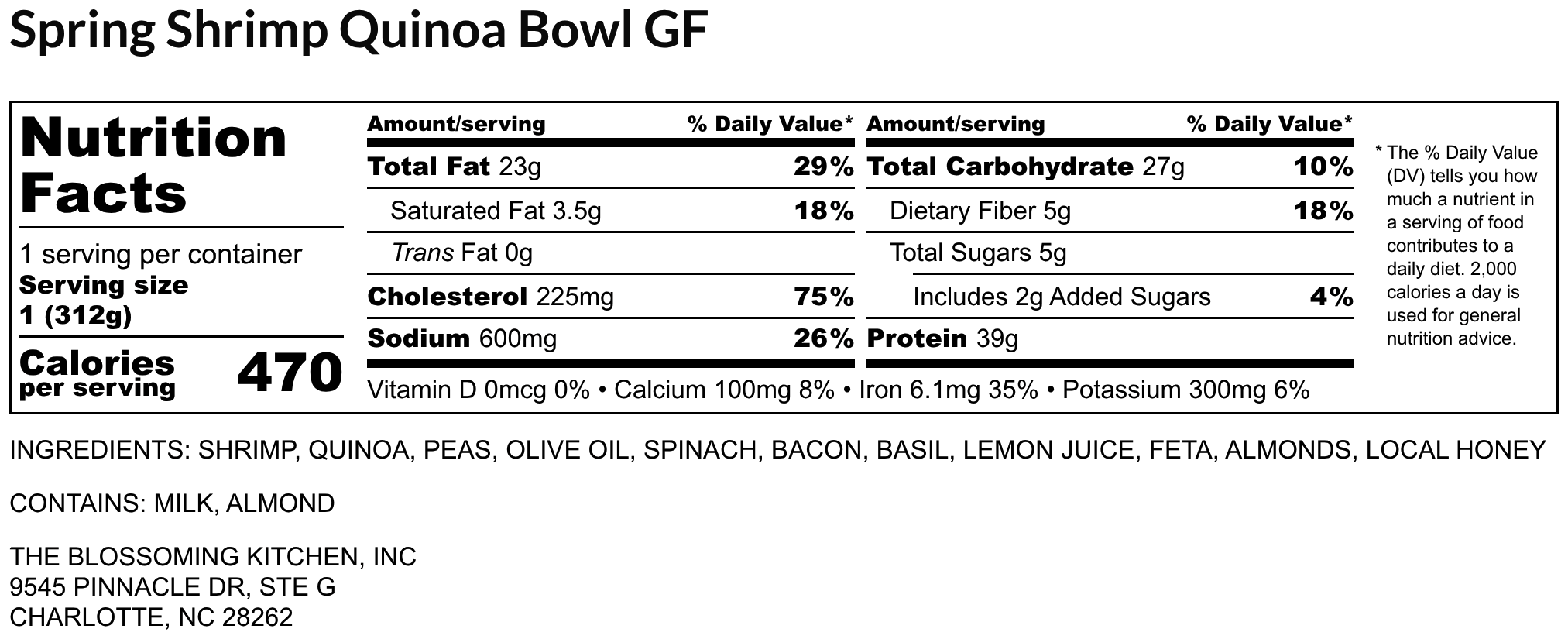 Spring Shrimp Quinoa Bowl GF – Nutrition Label Post navigationPrevious post: Spring Shrimp Quinoa Bowl (contains shrimp, milk, almond) GF Leave a Reply Cancel replyYour email address will not be published. Required fields are marked *Comment * Name * Email * Website Δ