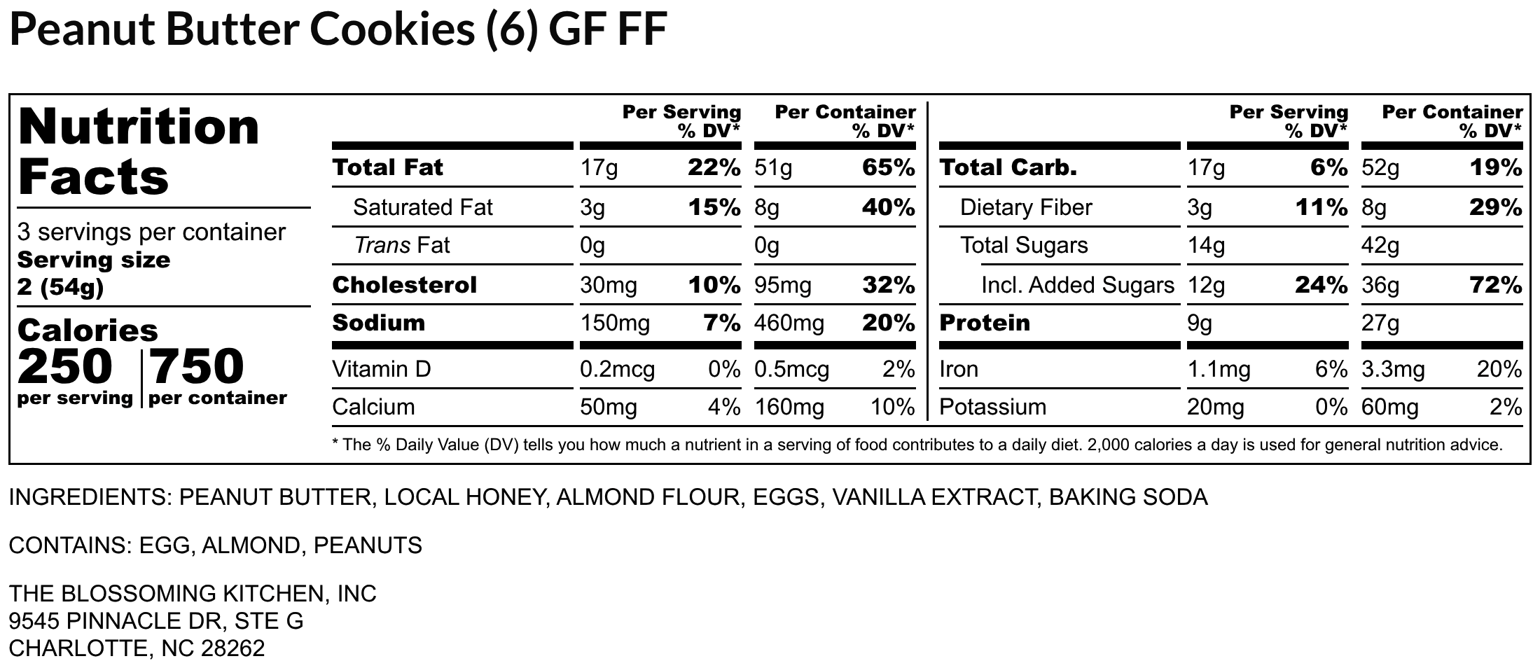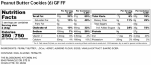 Peanut Butter Cookies (6) GF FF – Nutrition Label Post navigationPrevious post: Peanut Butter Cookies (6) (contains egg, almond, peanuts) GF FF Leave a Reply Cancel replyYour email address will not be published. Required fields are marked *Comment * Name * Email * Website Δ