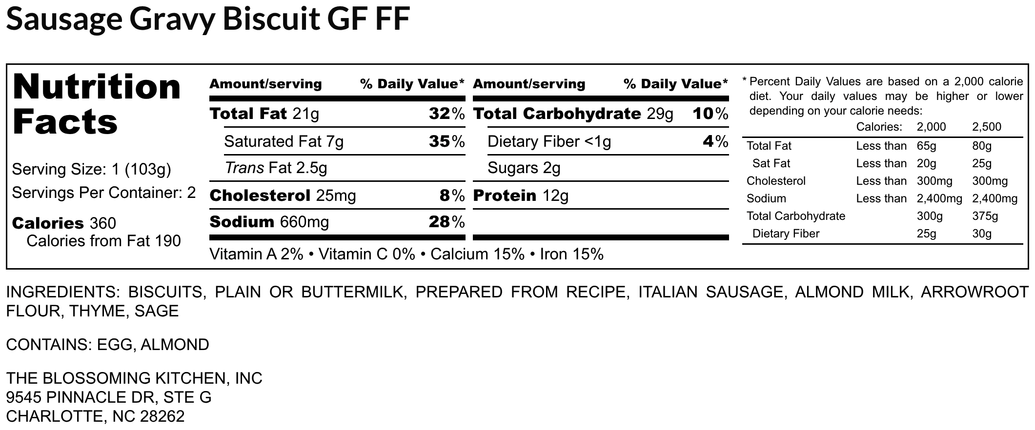 Sausage Gravy Biscuit GF FF – Nutrition Label Post navigationPrevious post: Sausage Gravy Biscuit (contains egg, almond) GF FF Leave a Reply Cancel replyYour email address will not be published. Required fields are marked *Comment * Name * Email * Website Δ