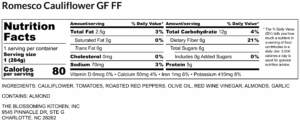 Romesco Cauliflower GF FF – Nutrition Label