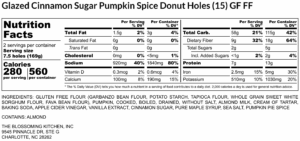 Glazed Cinnamon Sugar Pumpkin Spice Donut Holes (15) GF FF – Nutrition Label (3) Post navigationPrevious post: Glazed Cinnamon Sugar Pumpkin Spice Donut Holes (15) (contains almond) GF FF Leave a Reply Cancel replyYour email address will not be published. Required fields are marked *Comment * Name * Email * Website Δ