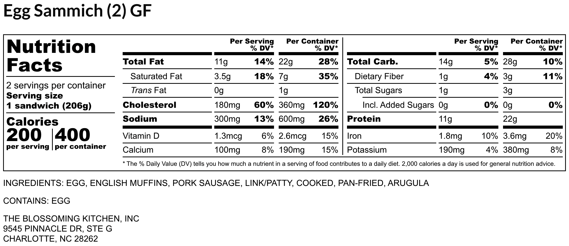 Egg Sammich (2) GF – Nutrition Label Post navigationPrevious post: Egg Sammich (2 each) (contains egg) GF Leave a Reply Cancel replyYour email address will not be published. Required fields are marked *Comment * Name * Email * Website Δ