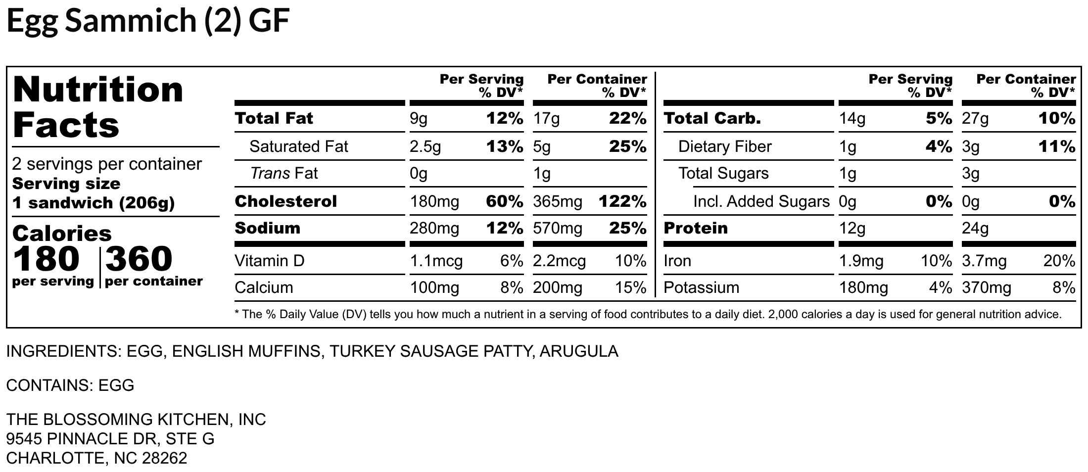Egg Sammich (2) GF – Nutrition Label (1) Post navigationPrevious post: Egg Sammich (2 each) (contains egg) GF Leave a Reply Cancel replyYour email address will not be published. Required fields are marked *Comment * Name * Email * Website Δ
