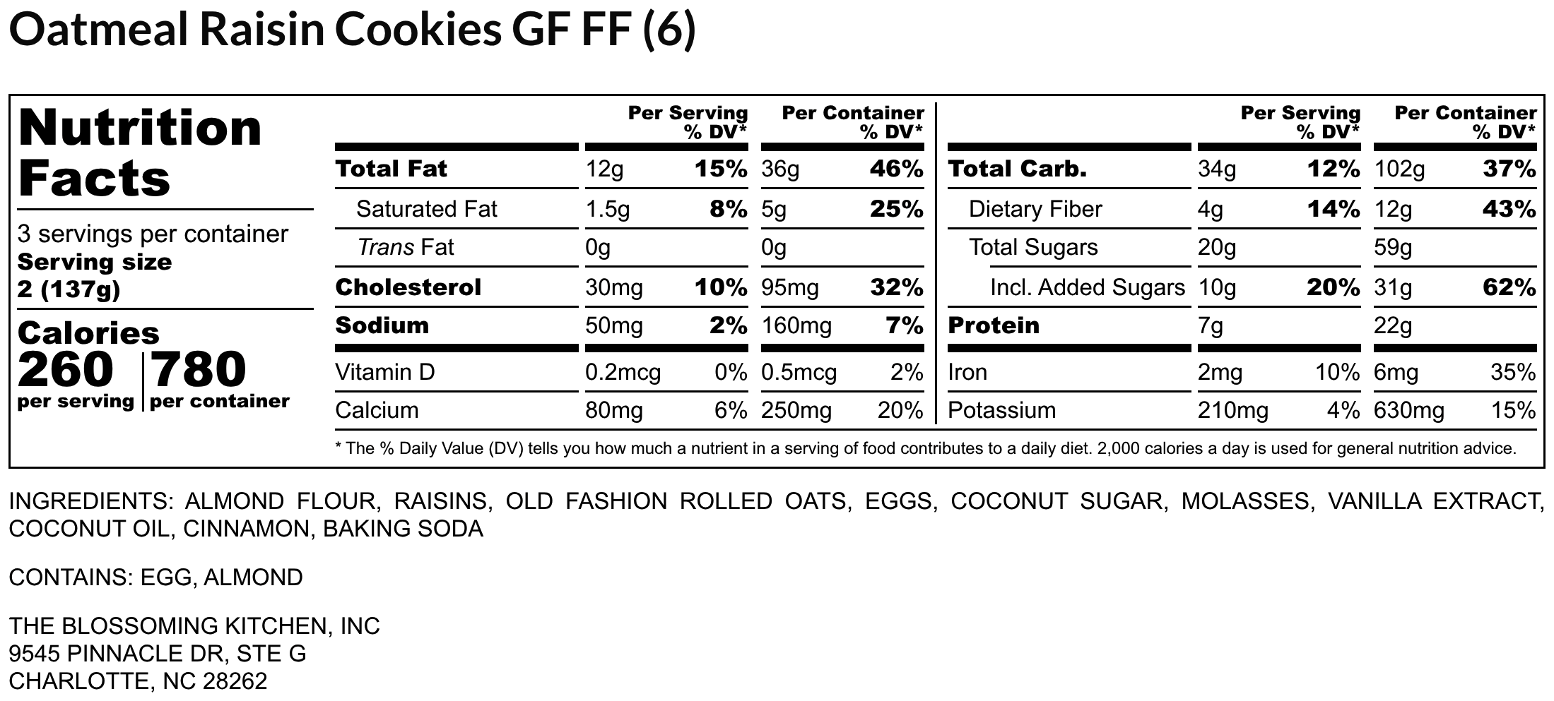 Oatmeal Raisin Cookies GF FF (6) – Nutrition Label (1) Post navigationPrevious post: Oatmeal Raisin Cookies (6) (contains egg, almond) GF FF Leave a Reply Cancel replyYour email address will not be published. Required fields are marked *Comment * Name * Email * Website Δ