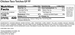 Chicken Taco Totchos GF FF – Nutrition Label Post navigationPrevious post: Chicken Taco Totchos (contains milk, egg) GF FF Leave a Reply Cancel replyYour email address will not be published. Required fields are marked *Comment * Name * Email * Website Δ