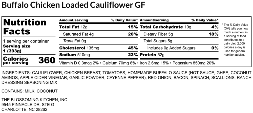 Buffalo Chicken Loaded Cauliflower (contains milk, coconut) GF
