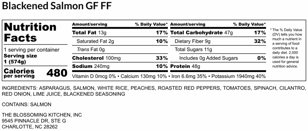 wild caught salmon – blackening spice – asparagus – spinach – white rice – peach salsa (peaches, red onion, lime juice, tomato, roasted red pepper) – cilantro