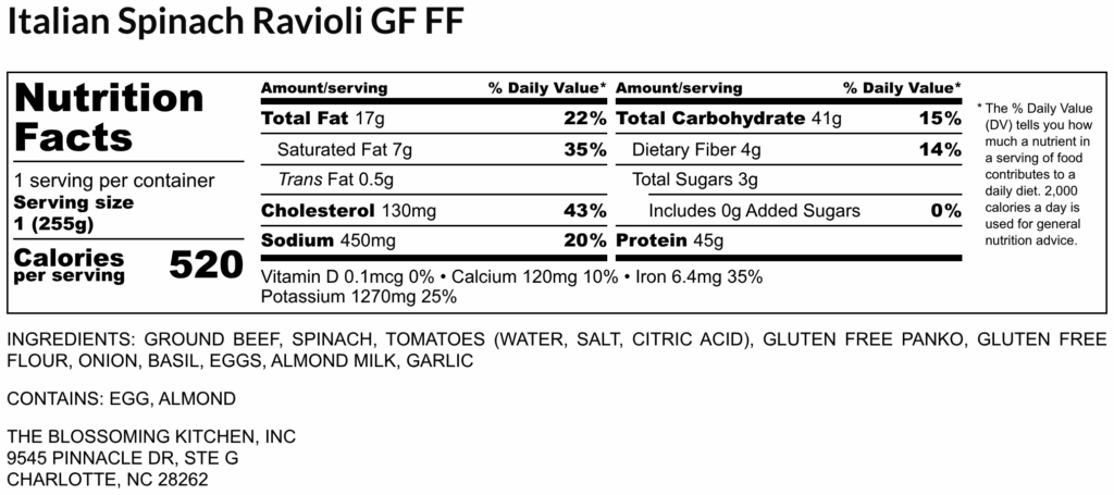 Italian Spinach Ravioli (contains egg, almond) GF FF