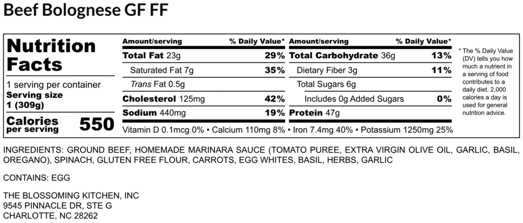 gluten free pasta – ground beef – onion – carrot – garlic – house made marinara – spinach – italian herbs – basil