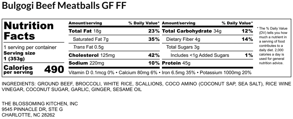 beef meatballs – bulgogi sauce (rice wine vinegar, minced pear, coco amino, garlic, sesame oil, honey, scallions) – broccoli florets – white rice – scallion – sesame seeds