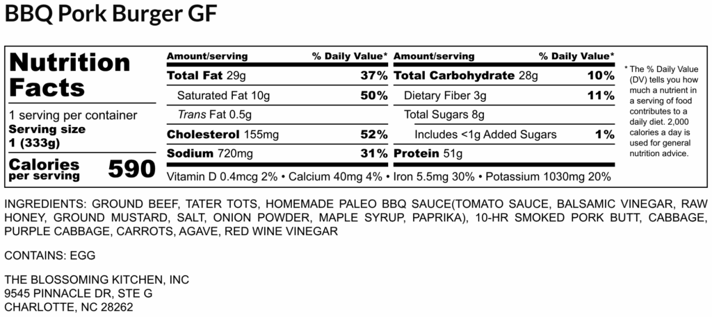 ground beef burger – pulled pork – bbq sauce – dairy free slaw (cabbage, purple carrot, carrot, vinegar, agave) – tater tots