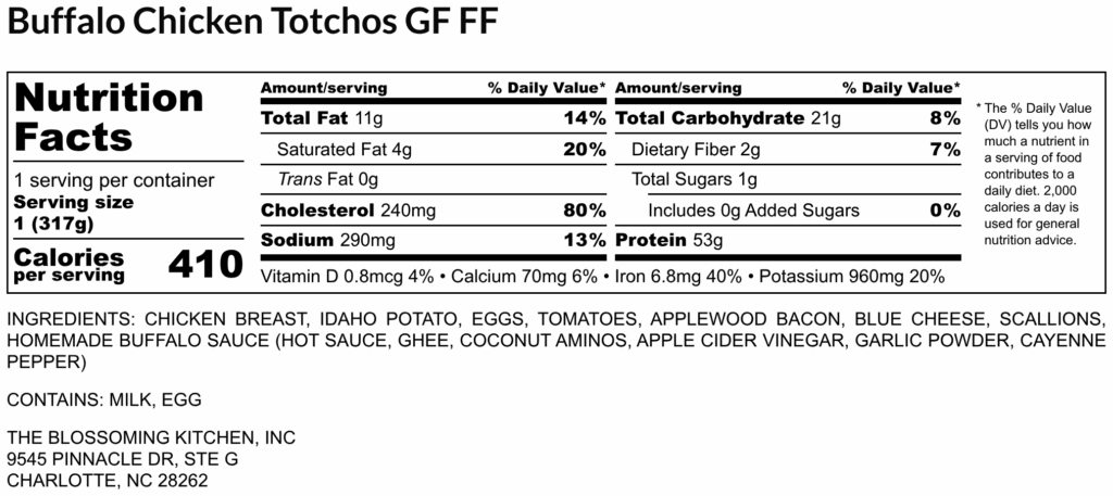 shredded chicken breast – buffalo sauce – idaho potato tater tots – diced tomato – applewood bacon – scallions – blue cheese crumbles (optional)