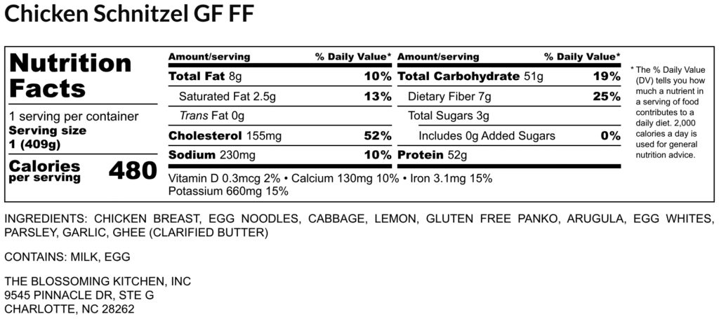 gluten free breaded chicken breast – egg noodles – cabbage – ghee – garlic – arugula – lemon wedge – chives