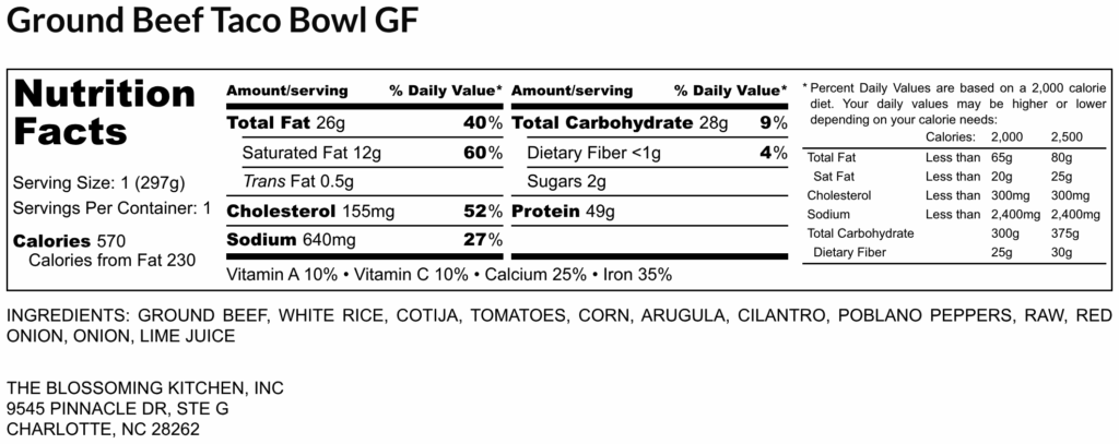 white rice – taco seasoned ground beef – arugula – mexican corn salsa (corn, sweet onion, cilantro, roasted poblano pepper, lime juice) – charred chipotle salsa picada (tomato, red onion, chipotle pepper) – grated cotija cheese (optional)