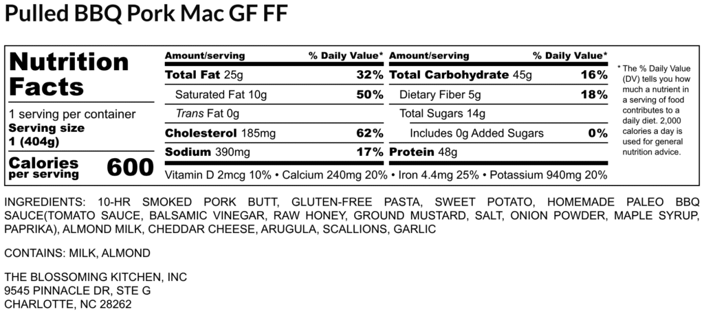 Pulled BBQ Pork Mac (contains milk, almond) GF FF