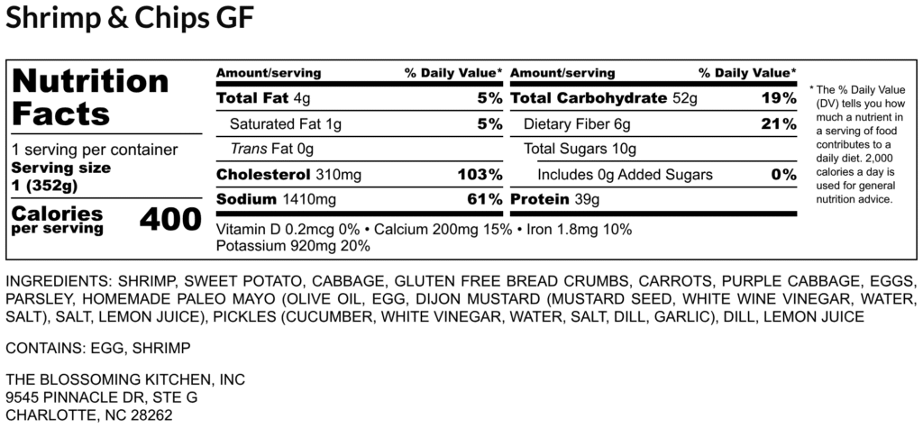 gluten free breaded nc shrimp (egg, gluten free bread crumbs) – hand cut sweet potato fries – tarter sauce slaw (cabbage, purple cabbage, carrot, paleo Mayo, pickle, paprika, dill, lemon juice) – parsley