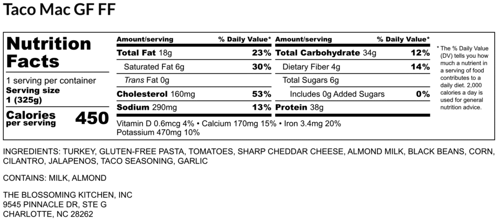 gluten free spiral noodles – ground turkey – taco seasoning – fire roasted tomatoes – black beans – fire roasted corn – jalapeños – cheddar cheese sauce (cheddar cheese, garlic, almond milk) – cilantro