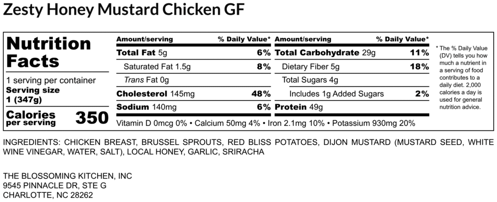 grilled chicken breast – roasted red bliss potatoes – garlic brussel sprouts – zesty honey mustard sauce (honey, dijon mustard, sriracha)